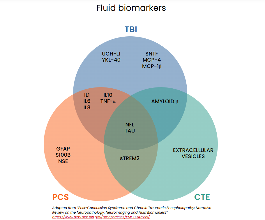 The schematic below illustrates biomarkers currently being studied for diagnosing concussion-related conditions.15,18,19